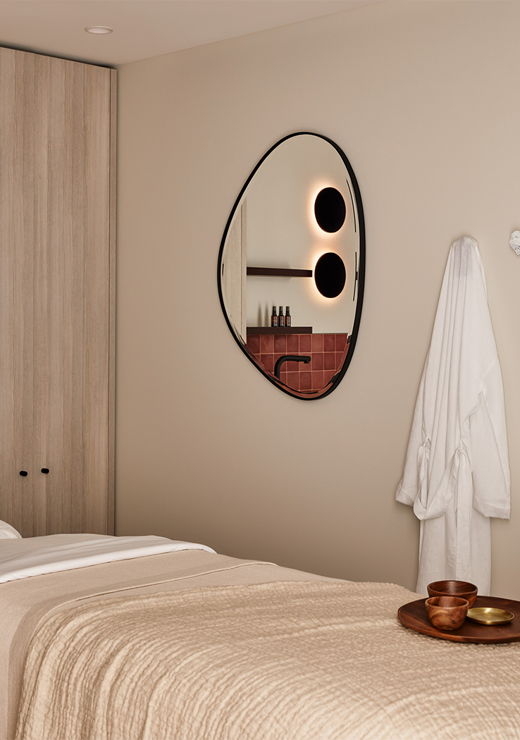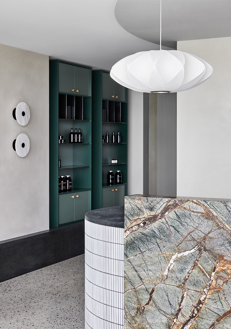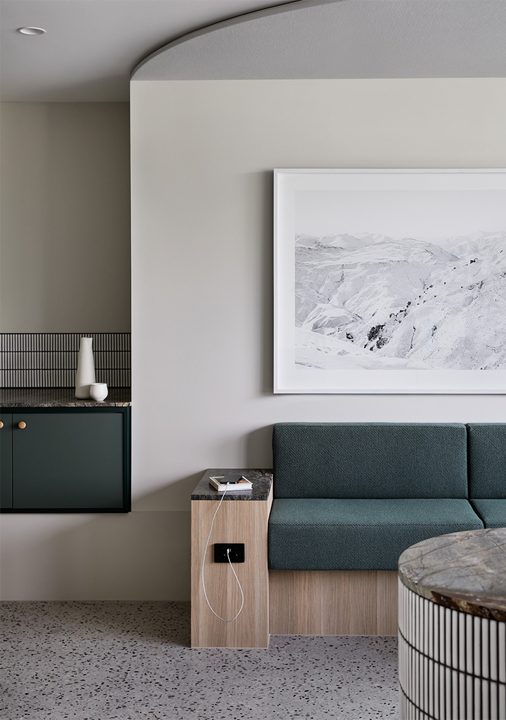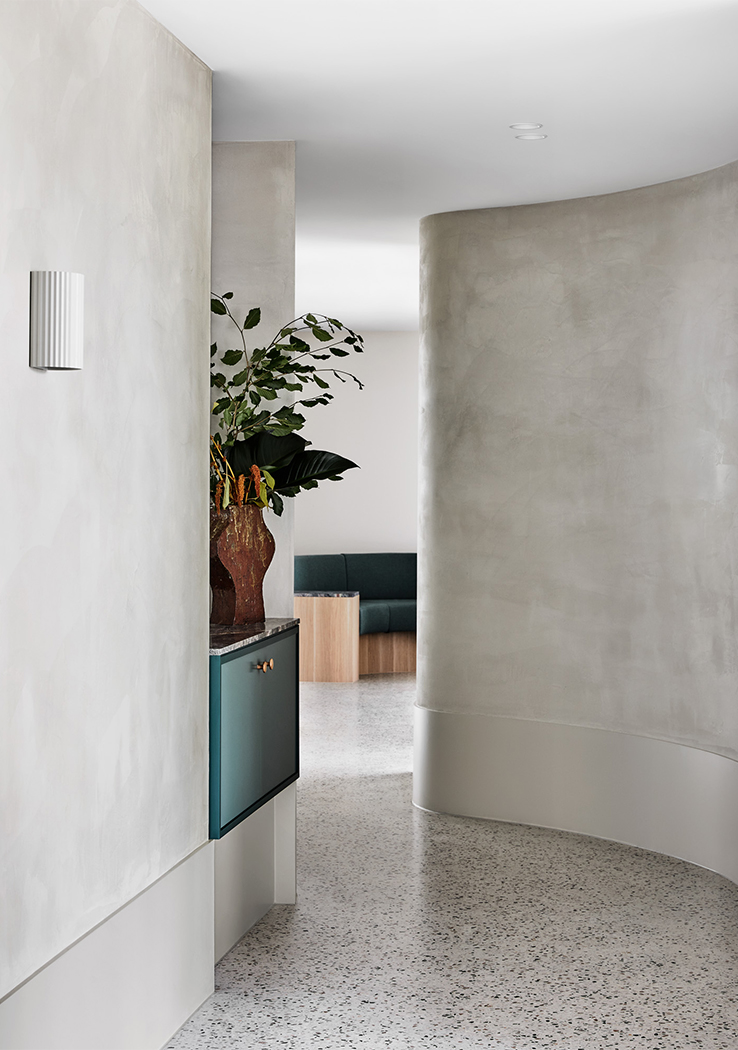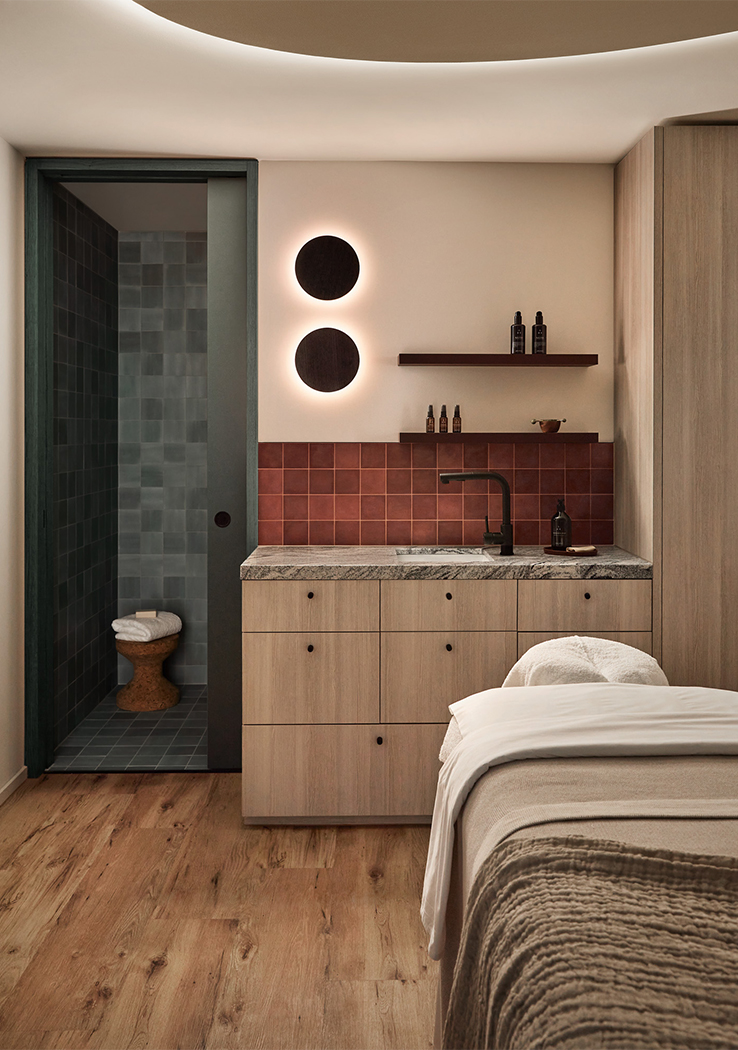 A palette of greens, greys, rusts and burgundy tones feature throughout, reflecting a sense of textural earthiness, whilst also being contemporary and sophisticated. A concrete floor with coloured aggregate is offset by forest green marble, sage green joinery and leather banquette seating, set against a backdrop of textured paint. Each treatment room is meticulously designed to ensure therapists have all equipment on hand, minimising movement throughout each treatment and between client appointments.
