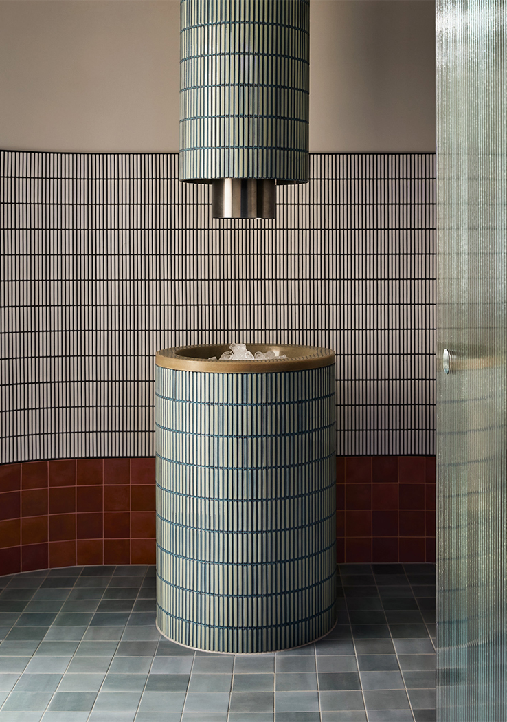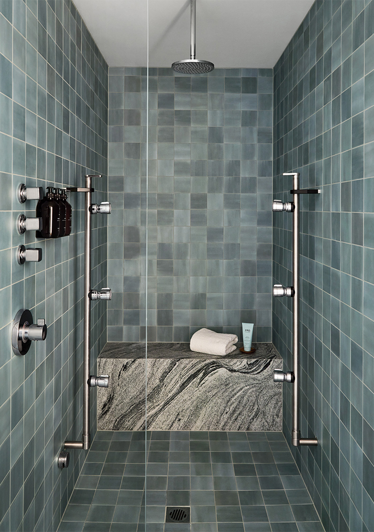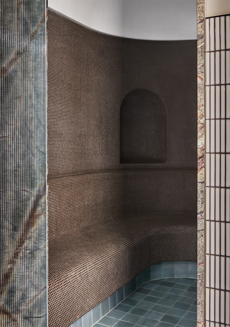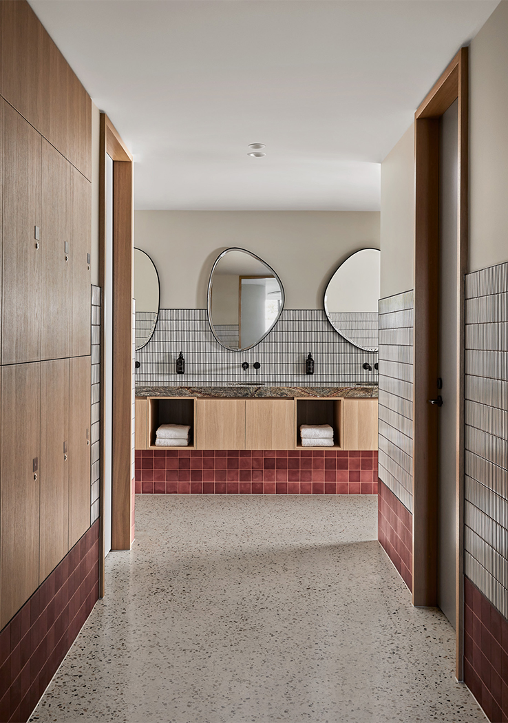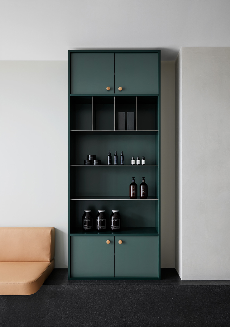 A palette of greens, greys, rusts and burgundy tones feature throughout, reflecting a sense of textural earthiness, whilst also being contemporary and sophisticated. A concrete floor with coloured aggregate is offset by forest green marble, sage green joinery and leather banquette seating, set against a backdrop of textured paint. Each treatment room is meticulously designed to ensure therapists have all equipment on hand, minimising movement throughout each treatment and between client appointments.