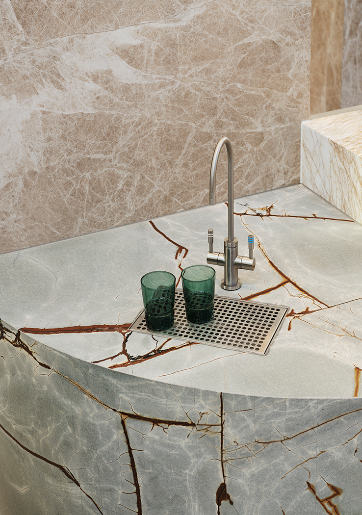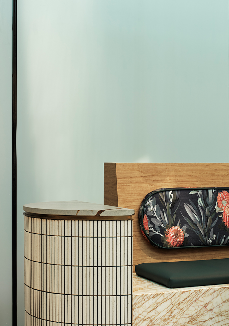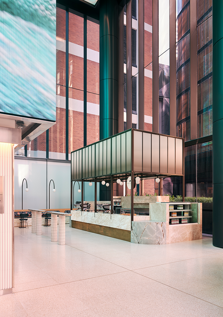 The project is Charter Hall Worldwide’s third cafĂ©. Designed to subtly reference the colours and flourish of a Major Mitchell cockatoo, the cafe uses soft pink, blue and brown stone, with touches of brass and fluted glass, to create a highly functional yet design led, food and beverage experience within the vast lobby space.