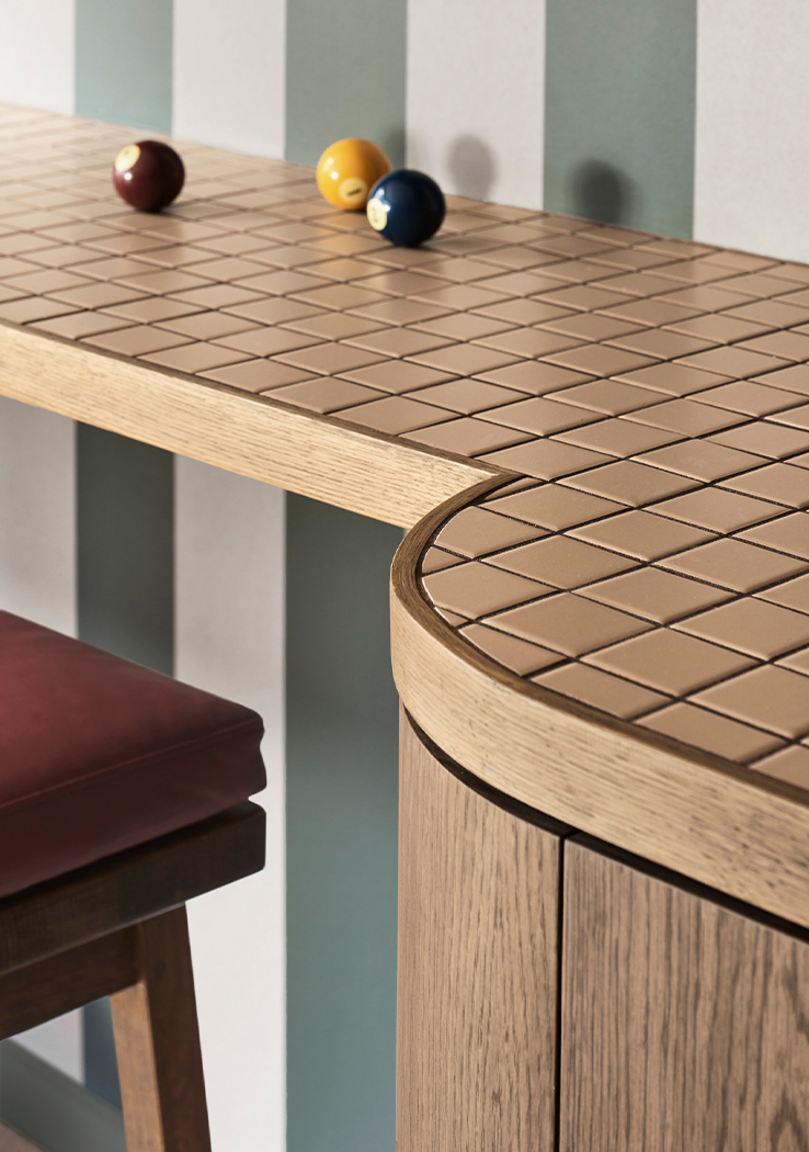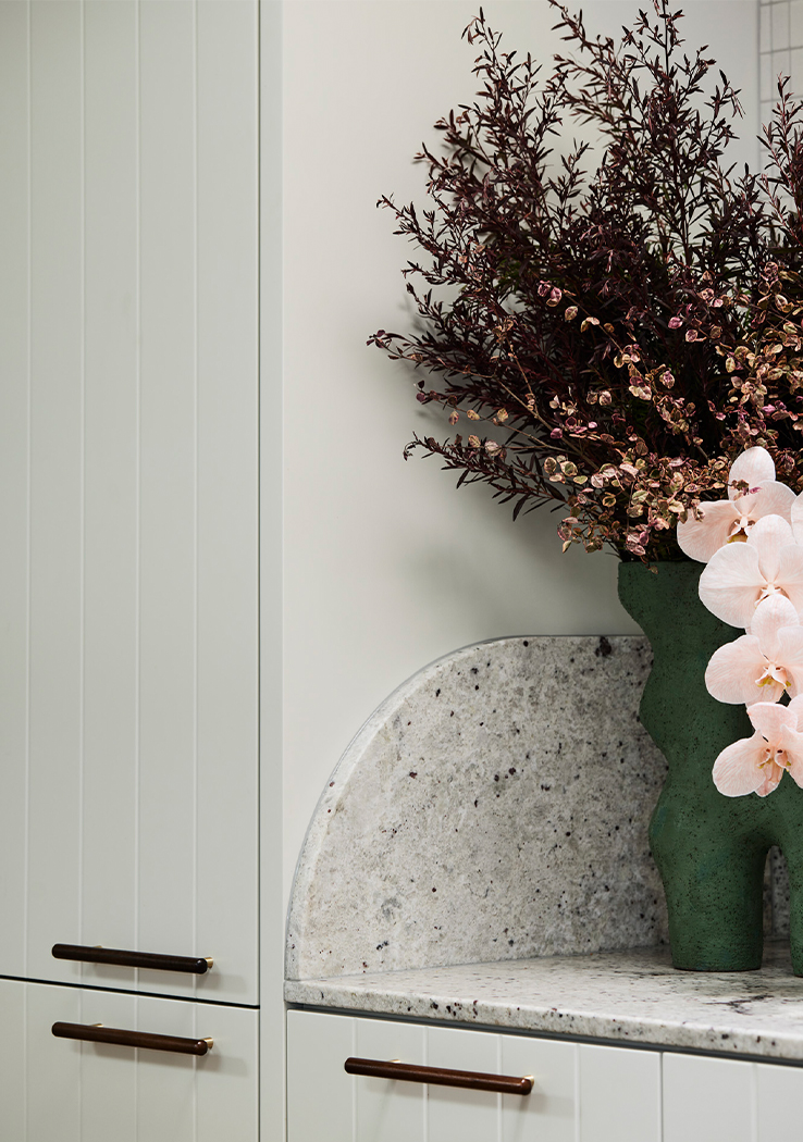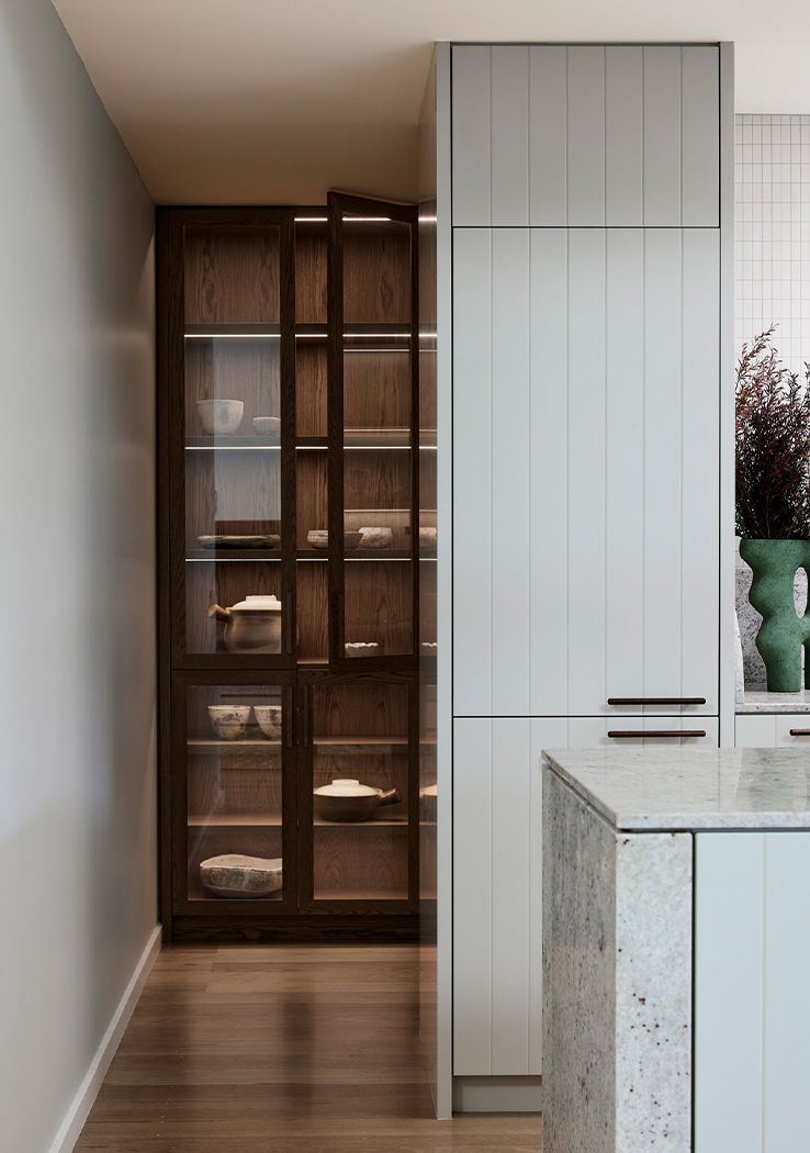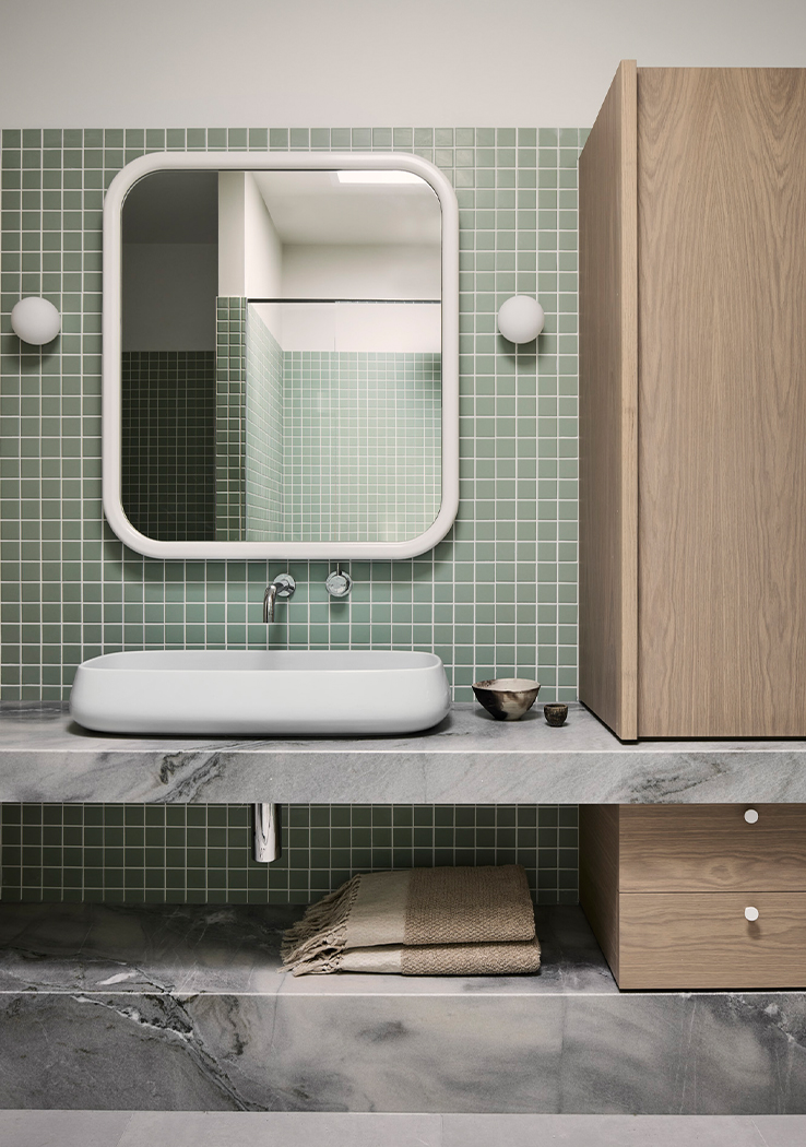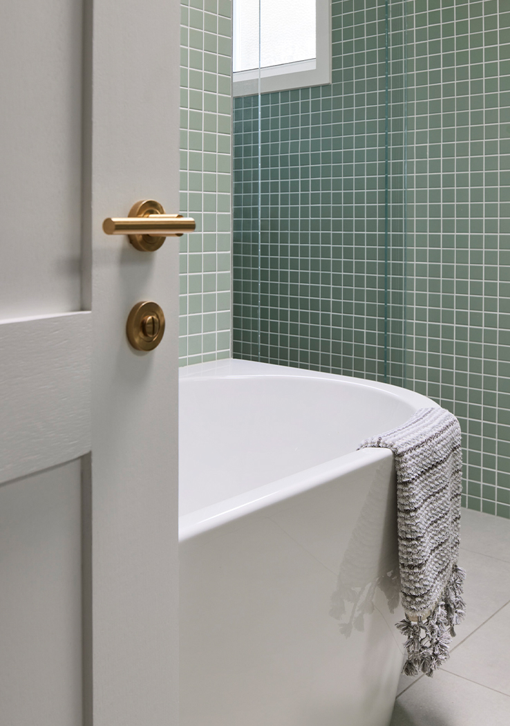 Drawing inspiration from the coastal surroundings, the interior features custom V-groove cabinetry reminiscent of beach shacks, pale granite benchtops mirroring rocky outcrops, and mosaic-tiled bathrooms reflecting playful sea tones. Designed to be used by the family whatever the season, the space