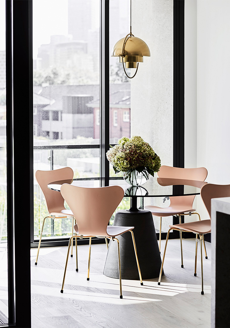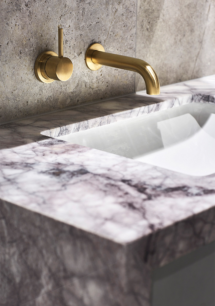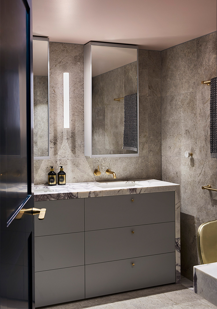 Details reflect the delicate shades and textures of a felt-lined treasure trove, from the soft grey and pink wallpaper lining the walk-in robe to the cocoon-like bathroom with its delicate pink painted ceiling, accented with black-veined pink marble.