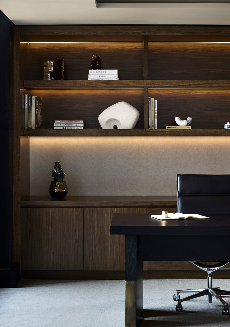 Charter Hall Worldwide utilised the floor plan’s east wing to host a boardroom, meeting rooms, collaboration space, quiet rooms and chairman’s office, finished in deep, moody finishes. Beyond, the longer west wing accommodates a light-filled open-plan workspace and Managing Director’s office, each afforded striking views across the bay. Adjacent joinery elegantly conceals lightboxes, white boards, pin boards, storage, and meeting booth utilities – highly functional, yet thoughtfully detailed to engender warmth, and encourage staff collaboration.